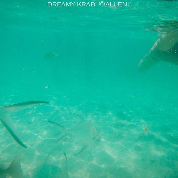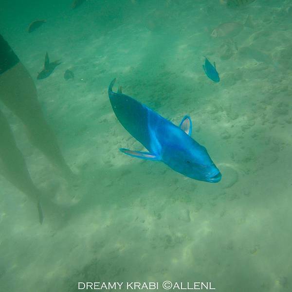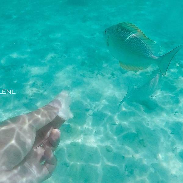 他们分了我一点面包,这下也能逗逗鱼儿了。大蓝鱼很贪吃,上来就是一口。尾巴真漂亮。这次想要试试更刺激的,直接手拿着面包,但是鱼儿还是有些怕人,不怎么敢上前。这条在我身边徘徊了好久,有一次已经离着非常近了,但马上又掉头回去……