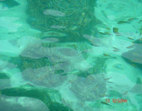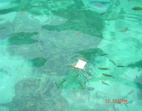 这里水很清,颜色很绿,透透的,轻易就可以看到鱼群。 丢一片面包下去,一会儿的功夫就被这些小家伙吃光了。 这里浮潜的话,可以看到一些珊瑚。