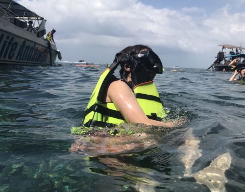 这里浮潜的话,可以看到一些珊瑚。这里水很清,颜色很绿,透透的,轻易就可以看到鱼群