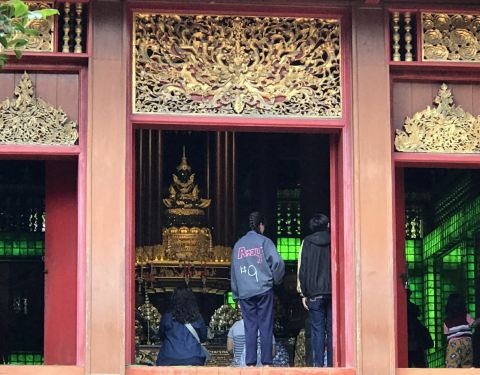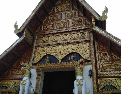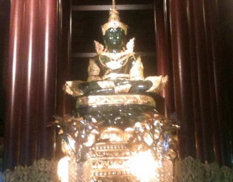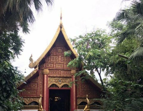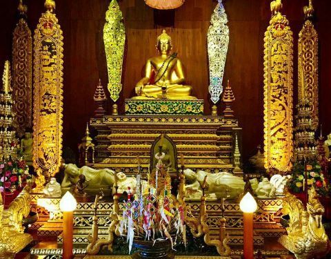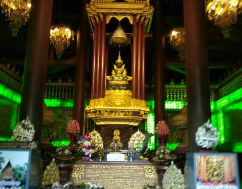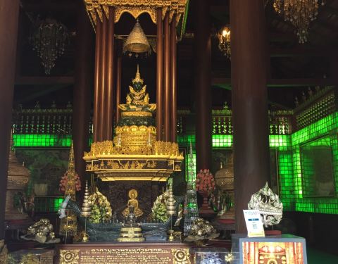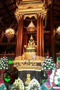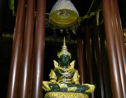玉佛寺得名玉佛寺是一座华美而精致的寺庙,也是有名的皇家寺庙之一。相传在1434年,一次闪电击中该寺庙中的一座佛塔,塔倒之后露出了藏在其中的玉佛。后来玉佛运往曼谷,被供奉在曼谷玉佛寺内,而这里也得名玉佛寺。翡翠雕成的大佛殿内有一座翡翠雕成的大佛,是教徒后来集资而得,高达65米,佛体是半透明的祖母绿色,周围镶着金色,看上去辉煌而闪耀。PhraChaoLanThong该寺庙还放置了一座有着700年历史,由印度巴腊艺术铸造的PhraChaoLanThong,它高3.8米、宽2米,是泰国王室为庆祝太后生日而打造的,它采用原来玉佛的样式,取了加拿大的青玉,送往北京雕刻而成。
