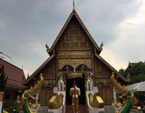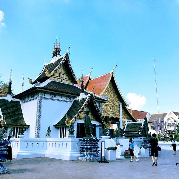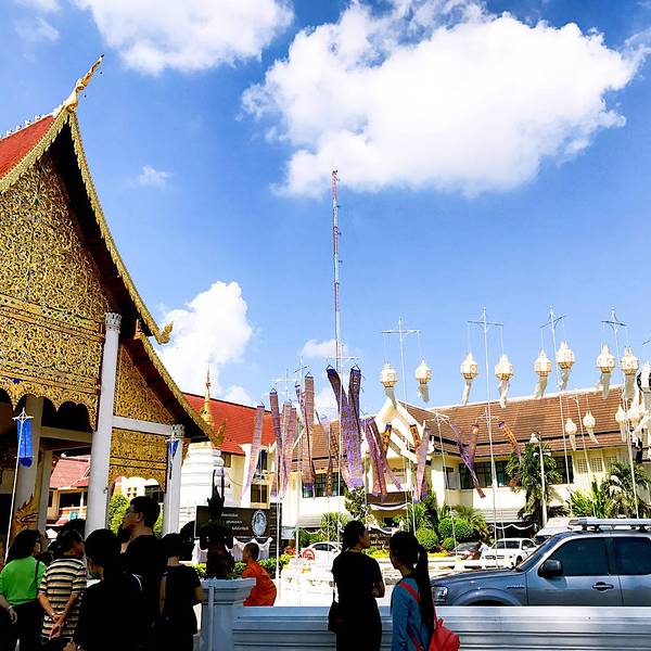是清迈古城里最大的一间寺庙,也是游人最多的寺院。这里因供奉着狮佛帕辛(Phra Singh)而出名清迈古城---清迈机场---长沙黄花机场;帕辛寺初建于1345年,是帕邀王(Pa Yo)为纪念他的父亲而建。是清迈古城里最大的一间寺庙,也是游人最多的寺院。这里因供奉着狮佛帕辛(Phra Singh)而出名。 在清迈地位最...清迈古城---清迈机场---长沙黄花机场;帕辛寺初建于1345年,是帕邀王(Pa Yo)为纪念他的父亲而建。是清迈古城里最大的一间寺庙,也是游人最多的寺院。这里因供奉着狮佛帕辛(Phra Singh)而出名。 在清迈地位最高、也是最大的一座寺庙,与 柴迪龙寺 齐名。位于主路 Ratchadamnern Rd 的最西端。1345年由曼格莱王初建,后经多次扩建才形成了现有的规模。寺中存放着卡福国王的骨灰,镀金大殿建于兰纳时代,内有精致的木雕,还绘有反映19世纪清迈人和寺庙日常生活的壁画,供奉着令人敬畏的镀金 Phra Singh 佛像,这是寺庙名称的由来。在曼谷和洛坤也有同名的佛像,据说都是在斯里兰卡制作的。以及浮雕精美的手稿珍藏室。寺院右侧角落坐落着拜莱殿,白色的墙壁与正面涂成金色的木头大门搭配协调。殿内有描绘清迈地方旧时衣着和生活习惯的壁画,被誉为泰北传统艺术的代表作。寺内的图书馆内收藏了很多经典著作,墙壁上装饰着合掌行礼的漆器女神像。 大门口有两只白色的神兽。寺内也是张灯结彩的,还有传统乐队在演奏。大殿内比较低调,以象牙白为主色调。寺外墙上有巨幅广告,都是关于佛事的。对面是 Wat Pha Bong。 展开