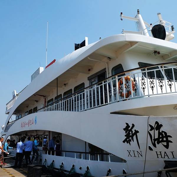 从蜈蚣峙码头到普陀山景区,大约有20分钟的路程,轮渡过去。我们是乘坐“新海华”号上的普陀山,看着窗外的“黄河”般的海水,一路游山玩水过去的感觉。只是觉得那海水太黄了,丝毫没有感觉那是一片片大海。蜈蚣峙码头需要过安检、也需要排队等候轮渡,人是超多的。最起码排了十分钟才到我们。船票居然也是实名制的,上面都有我们的名字,30元/人一次,好贵的感觉。白天最晚的一班船是5点钟左右,我们也是赶最后一班回来的。
