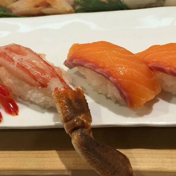 个人比较推荐三文鱼,金枪鱼寿司啊,口感很好,特别好吃,另外还推荐一个蟹腿肉的寿司啊,这个以前没有尝过