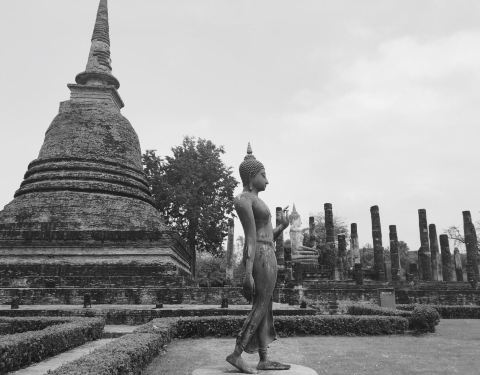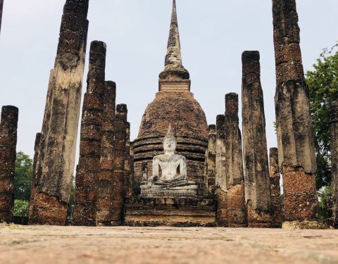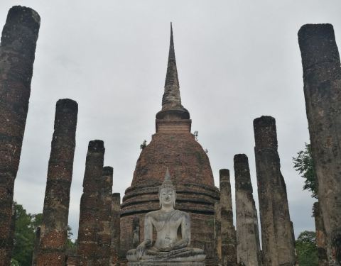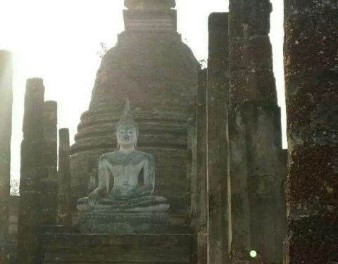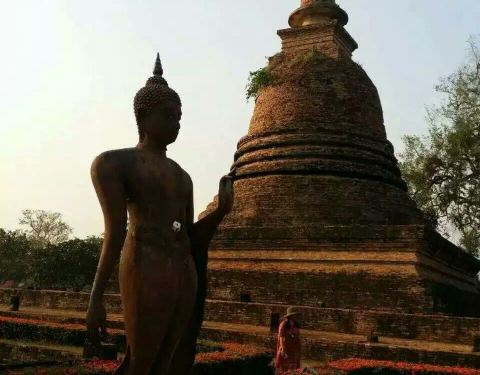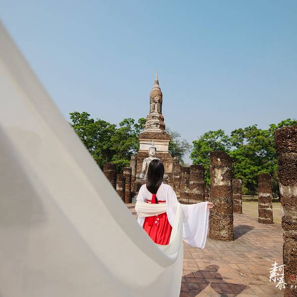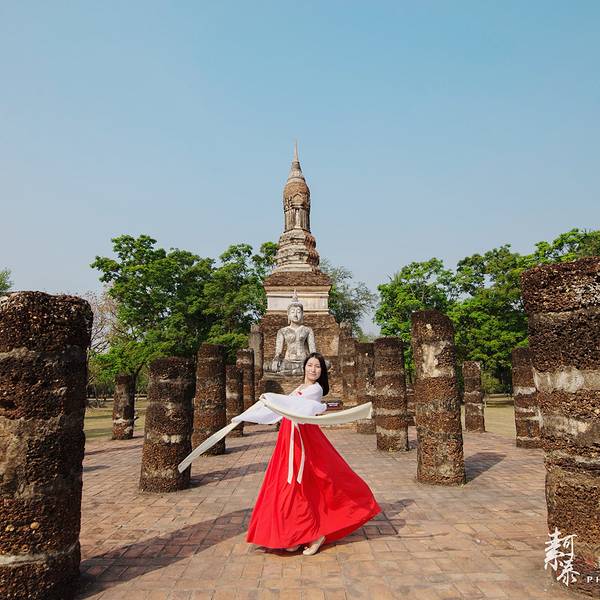 沙西寺又名 “ 圣池寺 ” ,它位于兰甘亨国王青铜纪念碑西侧的小岛上,这座寺庙目前仅存一尊大佛,一座佛塔和曾经的大殿倾瘫的石柱。之前姑娘穿着汉服曲裾和京都的木质寺庙很搭,今天她的汉服襦裙在南国的寺庙前...