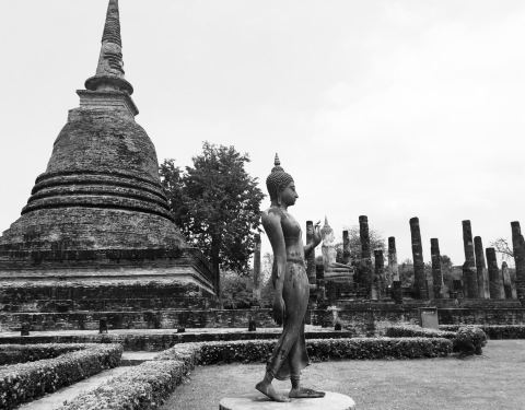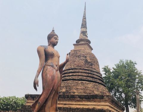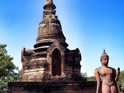 沙西寺建在历史公园湖心的一个小岛上,寺庙内有一座精美的行走佛,行走佛是素可泰独创的,是泰国艺术家的特别创意。佛像左足踏早地上,右足抬起,左手平胸前举起,右臂垂于身部,自然摆动,表现处在行走的路途中瞬间停止的生动姿态。寺庙附近有一个草棚,当地人会带着食物来这里野餐,非常热闹。如果你有兴趣,还可以租一辆摩托车,在公园里闲逛。