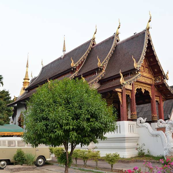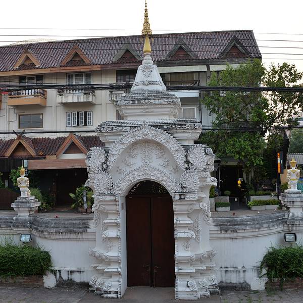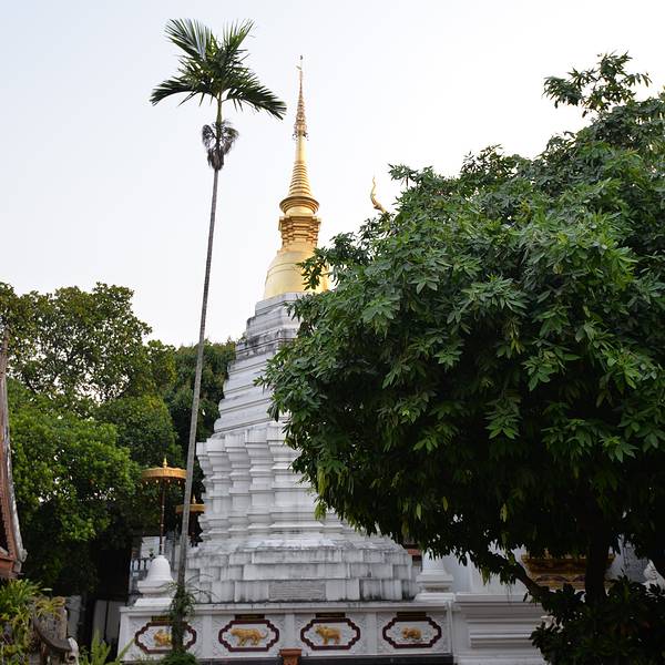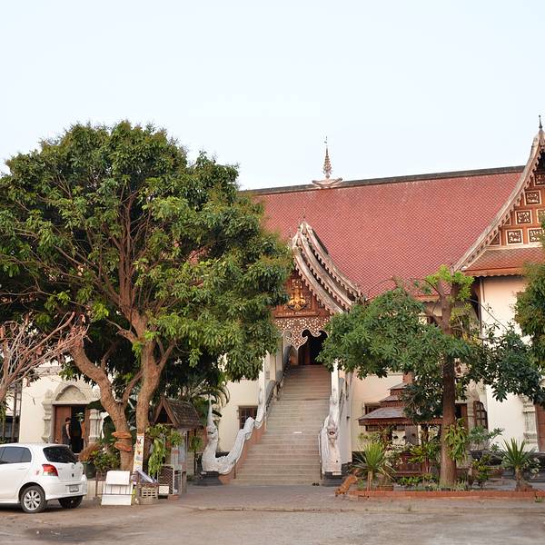 ...寺不远,清晨的寺院十分幽静,土木结构的兰纳风格的佛殿,白色的佛塔,寺院内还有一颗巨大的婆罗密树