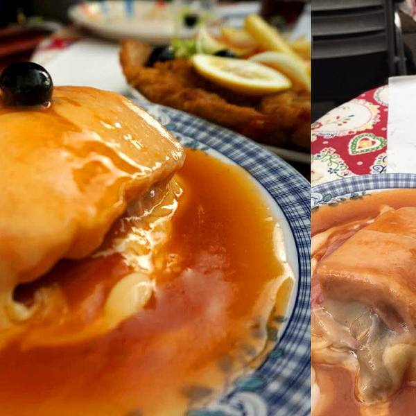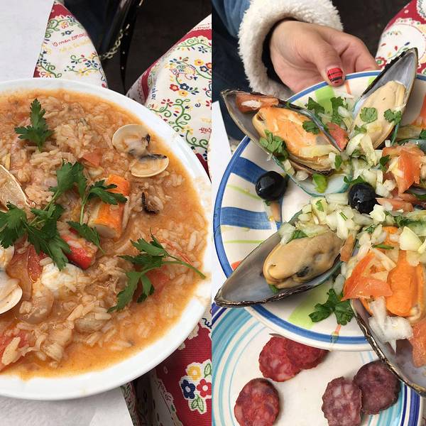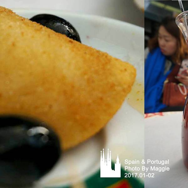 路过一个市场,里面好多廉价的纪念品,最最最里面有2家小餐厅, 我们在这解决了中饭,价格非常便宜 mercado do bolhao 你们就定位这个名字把,具体叫什么不知道。。下方的左边是葡萄牙海鲜饭,不同于西班牙这里的是湿的~ 最好吃的是右手的青口,才5欧元一份,5个巨大的青口,超级鲜这个好像是葡萄牙的特色小吃,我们尝试点了份,蛮难吃的,下次不尝试了。。 是2块面包中间夹了火腿和牛肉,还有起司片,然后汤汁是黏糊糊的番茄吧6欧元的章鱼沙拉,好吃的,非常新鲜 2欧元的香肠拼盘,好吃的,香肠也是葡萄牙特色,后来机场买了2根5欧元的都不如这蝶2欧元的好吃。炸鱼肉米饭套餐,这个一般般把,3欧元一份送了一份小吃,4个油炸的饺子,好吃的 另外,还有桑格瑞亚酒,也是5欧元,好喝~然后又开始疯狂的买买买, 下午4点大家回到酒店集合,拿着行李走向火车站