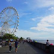 从走廊盘下来,就是 大名 鼎鼎的海滨路——罗哈斯林荫大道。 在19世纪末, 马尼拉 被誉为“ 亚洲 的 巴黎 ”,这里曾是全 亚洲 的贸易中心。由当时著名设计师丹尼尔•伯纳姆设计而成。后来这里散乱的遍布着各种小摊贩、杂耍者、魔术师等,直到07年的 马尼拉 新市长上任后下令整治,才得以使这条海滨大道成为“观日落的宁静之地”。马尼拉湾马尼拉 湾不仅是世界重要港湾之一,更有着全世界最美日落点的美誉。很多当地情侣喜欢依偎在宽敞的石头护栏上静静等待最美日落的到来。马尼拉湾马尼拉湾马尼拉湾不光是情侣,很多人像下面的这位老者一样,吹着海风,静静的享受着宁静的慢时光。马尼拉湾无奈天公不作美,上一秒还是湛蓝的天空,下一秒就风云突变,乌云满天。 伴随着天空掉落的几滴雨水,没能在 马尼拉 湾看一场最美日落也成了本次旅行的一大遗憾。但旅行就是这样,充满了各种未知,有遗憾的旅行才是完美的,因为我想这也会是再来 马尼拉 的一个动力吧。马尼拉湾马尼拉湾马尼拉湾在 马尼拉 湾,除了海浪拍打礁石的声音,还有坐着跳楼机的年轻人们传来的彼此交替的尖叫声。 去过了很多游乐场,像这样的海上游乐场我还是第一次体验。虽没有国内游乐场项目种类多,但是丝毫不影响年轻人们无比欢乐的心情。马尼拉湾游乐场售有通票,会在你手腕上系个圆圈,比单个项目乘坐要便宜。单坐碰碰车的话是299p一次,15分钟。 排在我前面的这对父子俩全程十足的电影画面感。所谓童年的美好,此情此景,一座城,一辆车,一个陪伴着你的人。马尼拉湾小帅哥很配合的给我拍照,他的爸比也“皮”了一下,背对镜头摆了个剪刀手。马尼拉湾海边大道上遍布着餐厅酒吧,如果你在 马尼拉 的晚餐还没着落,不如就来这边,除了世界级的日落,当然也还有壮观的夜景。 由于乌云突然席卷,我只好望“湾”兴叹,悻悻而归。马尼拉湾马尼拉湾
