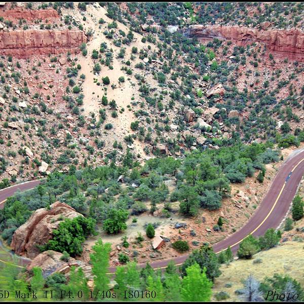 事情是这样的,我们从Tropic小镇出发,所以进了公园的东入口,进来之后要开将近一个小时才会到Visitor Center,这一路的九曲十八弯,我还一不留神把车子给蹭了。小夏同志一直在提醒我车子太靠右边了,可是车子也很靠左边啊,车道很窄,连着拐很多360度的大弯,所以还是车技好的同志们来开车吧。