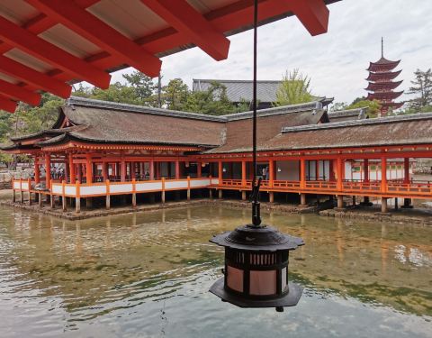 严岛神社以正殿为中心,左右有长约300米的回廊,以优雅的姿态向海中展开,其间点缀着石灯笼,耀眼的金红廊柱宣告着神灵的威严。
