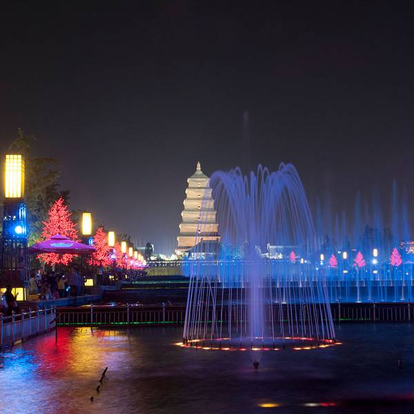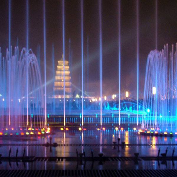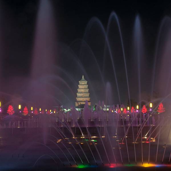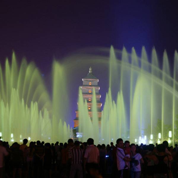 大雁塔音乐喷泉广场位于著名的大雁塔脚下,定大雁塔为南北中心轴。