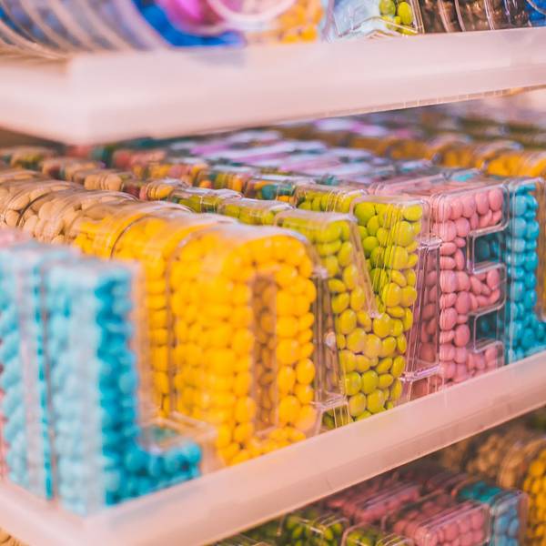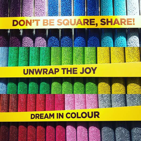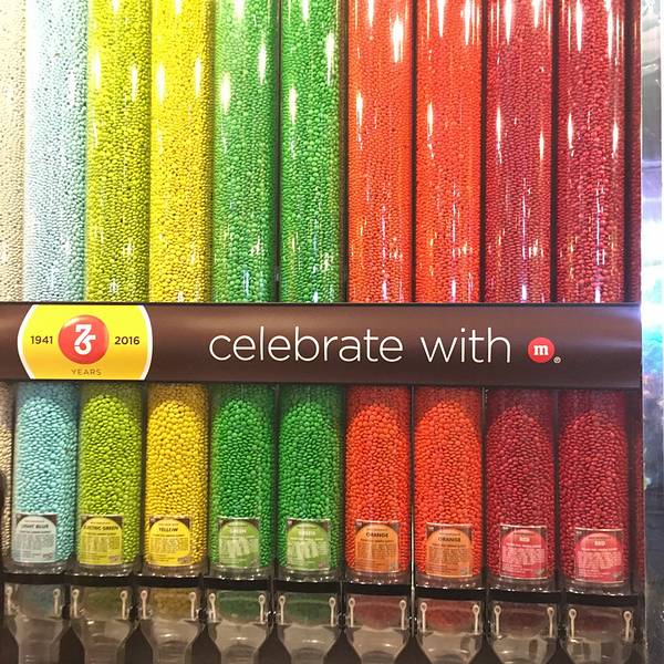 2、这里有一面彩虹色的M&M豆墙,在这里可以买到市面上没有的颜色,例如粉红色和金色等,按重量收费。