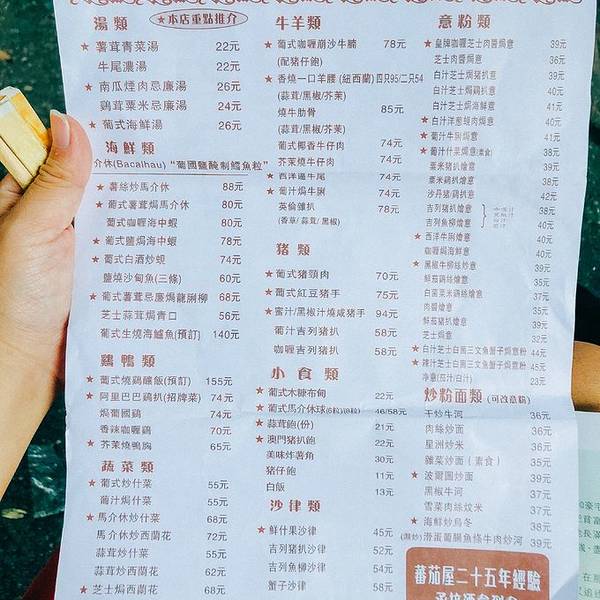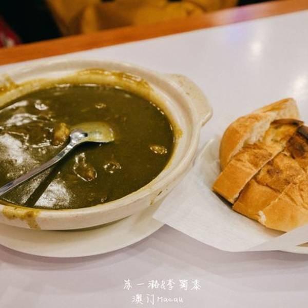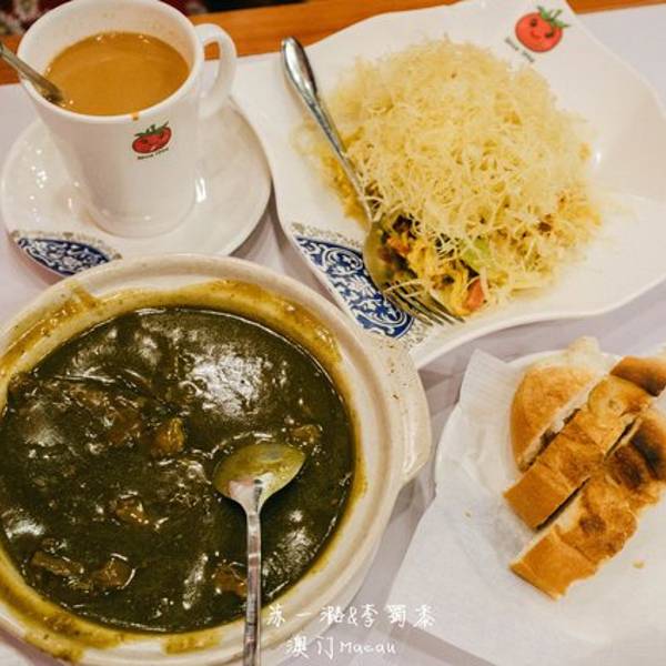 番茄屋葡式美食:大三巴下二十年老店 这家餐厅是平价葡国餐厅,价格不算贵,很多人推荐。就是餐厅在山上,位置有点难找,我们是沿着哪吒庙斜巷 ,一直网上爬山,等看到哪吒庙,往右拐就能看到店面了。我们下午1点去的,门外已经很多人在排队了,我们进门叫号,店员在小本子上写下预订人的姓和用餐人数,然后等店员叫名字就好。等待期间,我们就看菜单选菜。我们等了大约20分钟,就进到店里了。餐厅分两个用餐区,桌子比较小,但是客人都坐满了。我们点了薯丝炒马介休(88澳门元)、葡式咖喱崩沙牛腩配面包(78澳门元)、薰衣草奶茶(18澳门元)、木糠布丁(22澳门元)、可乐(11澳门元),一共217澳门币。其中马介休是葡国特色腌制鳕鱼,薯丝炒马介休价格也不低,但是个人感觉这道菜性价比略低,因为里面大多是薯丝(炸得细细的土豆丝)、炒鸡蛋、腊肠和洋葱,马介休的数量非常少,而且菜品略微偏咸,不过算吃个新鲜吧。 葡式咖喱崩沙牛腩真心推荐,葡国咖喱并不辣,但是咖喱那种复杂香料的味道又很浓厚,牛腩炖得超烂,跟咖喱融为一体了,配着热乎的猪仔包(没有猪,是面包)吃,非常美味。别看这咖喱颜色不咋地,但是味道超赞的,配米饭吃也可以哦。我还好奇点了杯薰衣草味道的热奶茶,emmm……味道很奇特,但是也还能入口,满足了我的好奇心。最后甜品是木糠布丁。木糠布丁也是澳门特色甜品了,一般甜品店里都会卖,甚至连奶茶都可以放木糠。这里的木糠是指那种很细腻的饼干碎,类似巧克力粉,又比巧克力粉更粗一些。布丁的口感是滑滑的,奶味很浓,布丁上面撒的木糠又是微粘的细滑的颗粒感,口感层次丰富,一口咬下去,满满的幸福感。总体来说这家餐厅还不错,而且我们用千元大钞结账,也顺利换到了零钱。番茄屋实用信息: 地址:连安后巷富安大厦4号 (哪吒庙旁,哪吒庙斜巷爬山上去) 营业时间:网上信息不一,有说11点开门,也有说11点半开门。基本上要排队。 人均价格参考:110澳门元 推荐菜:葡式咖喱崩沙牛腩(强烈推荐)、薯丝炒马介休(一般,可以试试马介休球)、阿里巴巴焗鸡扒、木糠布丁 菜单价格参考