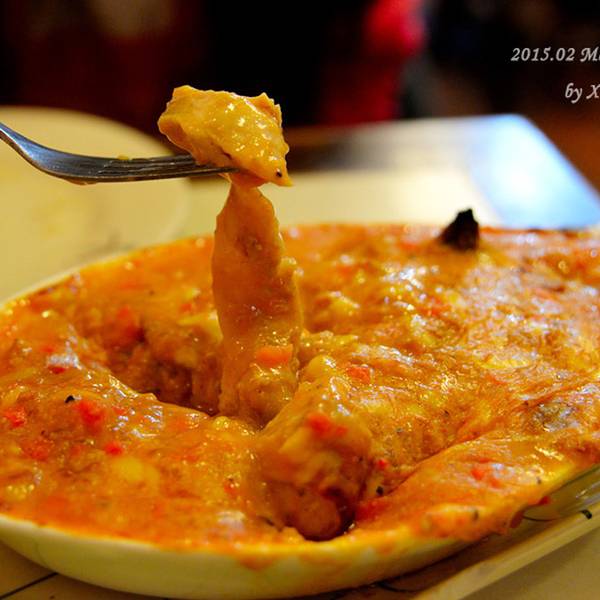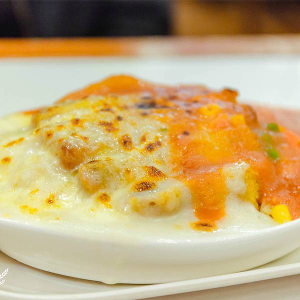 不得不说,在澳门找吃的不容易,找到好吃的葡式餐厅也有难度。澳门跟香港最大的区别就是,餐厅不是随意开,如果你在路上饿了想要找比较便宜的小店吃饭那真的吧不是容易的事情,除非去酒店里面进行高消费。推荐一家当地很好吃又便宜的葡式茶餐厅,番茄屋。要穿过居民区才能找到,这家店很火,有很多当地人和外地游客来吃。强烈推荐这家店的芝士焗饭系列,如果你是芝士控一定不要错过,满满的芝士融入口中,烤得芝士饭金黄的。我点了一个白汁混搭番茄汁的芝士焗鸡扒饭,味道确实不错。这个普普通通的芝士饭也是很香,舀起一勺子,浓浓的芝士酱还能拉丝,真的无比诱人,口水直流。