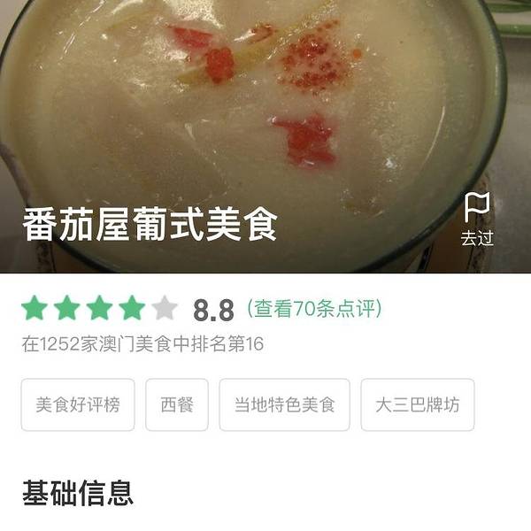 不得不说,在澳门找吃的不容易,找到好吃的葡式餐厅也有难度。澳门跟香港最大的区别就是,餐厅不是随意开,如果你在路上饿了想要找比较便宜的小店吃饭那真的吧不是容易的事情,除非去酒店里面进行高消费。推荐一...不得不说,在澳门找吃的不容易,找到好吃的葡式餐厅也有难度。澳门跟香港最大的区别就是,餐厅不是随意开,如果你在路上饿了想要找比较便宜的小店吃饭那真的吧不是容易的事情,除非去酒店里面进行高消费。推荐一家当地很好吃又便宜的葡式茶餐厅,番茄屋。要穿过居民区才能找到,这家店很火,有很多当地人和外地游客来吃。强烈推荐这家店的芝士焗饭系列,如果你是芝士控一定不要错过,满满的芝士融入口中,烤得芝士饭金黄的。我点了一个白汁混搭番茄汁的芝士焗鸡扒饭,味道确实不错。这个普普通通的芝士饭也是很香,舀起一勺子,浓浓的芝士酱还能拉丝,真的无比诱人,口水直流。