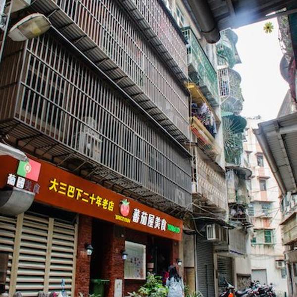 开在居民楼里的美食来到澳门自然要体验一下平时比较难享用到的葡萄牙美食了。 和小飞象、木偶那些名声赫赫、价格不菲的网红店相比,番茄屋显得低调很多,价格也非常亲民,周一中午还有特惠,指定美食饮品可以半价。 虽然在大三巴附近,但不在手信街,所以很少有游客会经过。 点了几个推荐的招牌菜,味道一级棒,份量也超级大,两个女生撑到扶墙。 阿里巴巴鸡扒焗饭算是必点之一,标准的西式焗饭,鸡肉多且嫩,幸福的芝士拉丝让人欲罢不能。 薯丝炒马介休也是特色,菜单上特别注明了马介休是纯手工撕的,很费工啊~~~马介休是一道经典的葡国美食,其实是腌过的鳕鱼,吃起来完全不腥,搭配土豆丝咬起来脆脆的,更像是一道小零食。 木糠布甸是除了蛋挞之外澳门的另一种招牌甜点,布丁上面撒了些木糠粉,干干的,甜甜的,不知不觉就消灭了一大半。金黄焦脆的色泽让人看着就食欲大增澳门的奶茶也是传统港式的味道