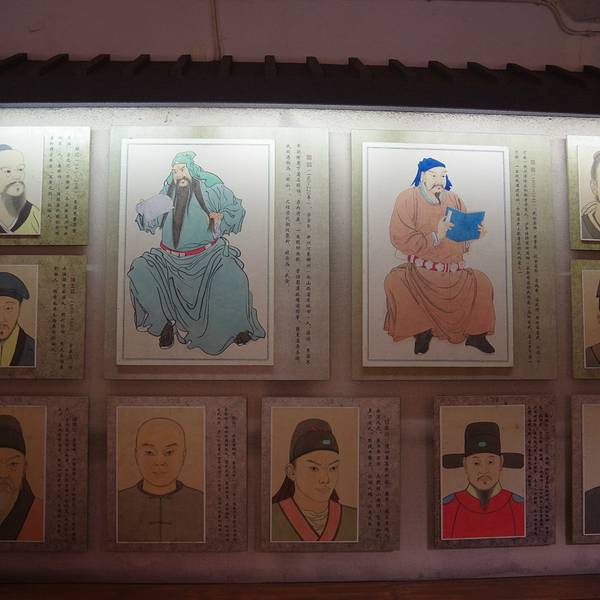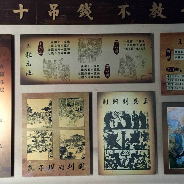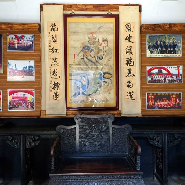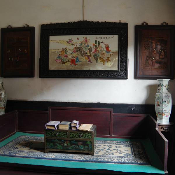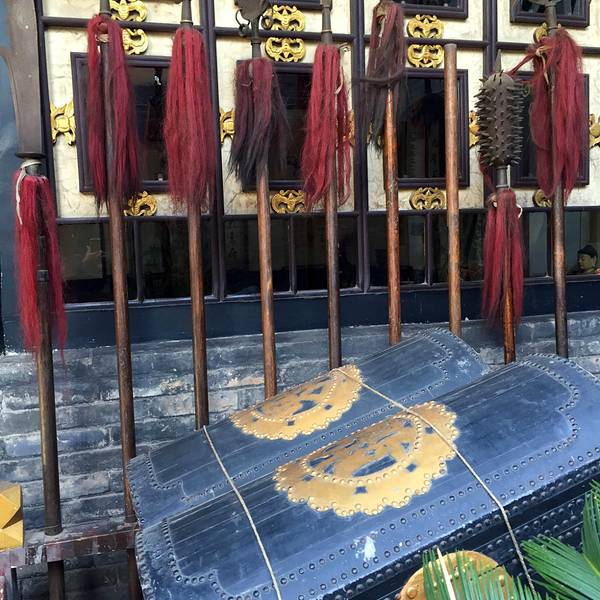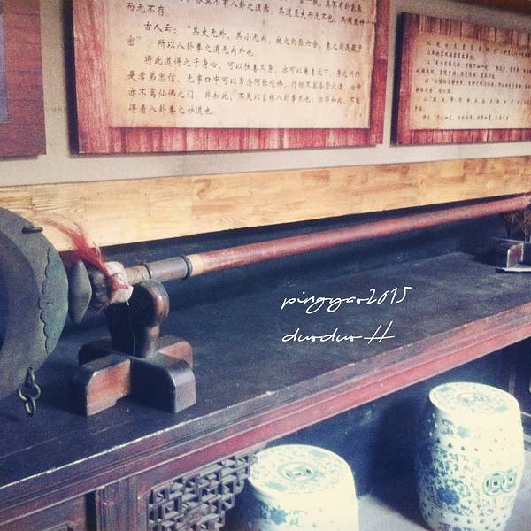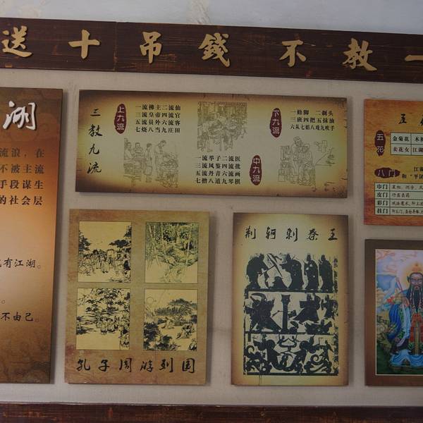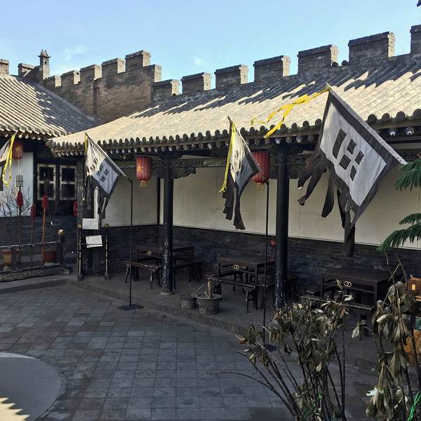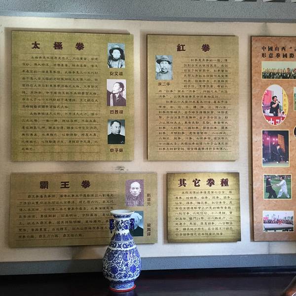 汇武林院落深幽,狭长的庭院,放置着石刻大元宝。一进院的牌匾黑底金字写着海川两个大字,两侧是两面武德,商谊的三角旗,走进大院感觉江湖和武德气氛浓浓。这个大宅院曾经是平遥八卦掌大师王伦旧居,他在这里开办武术训练班,弟子如云。王伦以拳会友,参禅修道故事传世。二进院展示中国武术发展历史,武术流派,著名的武术教头。牌匾上写着海纳百川。厢房是不同的展室,不懂武术的能了解一些武术的真谛,比如太极拳,形意拳和五行说相关的基本拳理,内含的佛,儒和道教的文化,理论很深。八卦掌师承韵言读起来朗朗上口。武术馆里的很多对联令人感慨,仿佛听到了江湖武林高手心声。