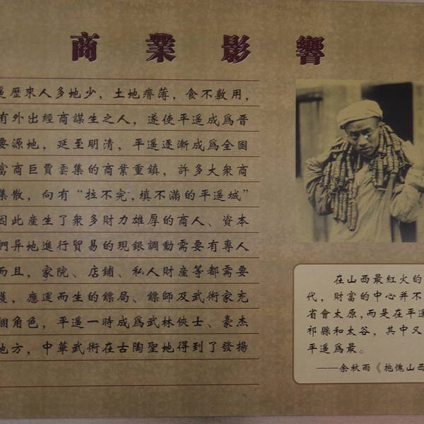 ...才要门票,古城实行一票通,有效期三天,但是都进了古城了,不买门票进去看看真对不起这么美的古城哦平遥自古以来票号发达,自然带动镖局也兴盛。有票号,必有镖局,可以说镖局就是应票号而生的。汇武林就是其中一家,坐落在平遥古城西大街上,与中国第一家票号日升昌倚门相望,原为清末民初平遥著名八卦掌拳师王...平遥自古以来票号发达,自然带动镖局也兴盛。有票号,必有镖局,可以说镖局就是应票号而生的。汇武林就是其中一家,坐落在平遥古城西大街上,与中国第一家票号日升昌倚门相望,原为清末民初平遥著名八卦掌拳师王伦先生的旧居,是南北各地内外拳师以武会友、切磋技艺的场所。现在作为传统武术陈列馆重新开放。全馆共设九个展室:历史久远、今日辉煌、英豪武将、武林十杰、太极宗师、形意高手、八卦名家、儒释道始祖等。汇武林全院青砖灰瓦,装饰繁密,仿明清风格,武术馆坐北朝南,分前后两个部分,前面部分为陈列馆,共三进院落;后面部分是演武厅和习武场。这里有展示平遥武术源流以及中华武术流派及宗师的展室,也有介绍各种武术武功,比如太极拳,形意拳,八卦掌等等。平遥古城门票130元一张,学生半价。进入古城是不需要门票的,古城内的景点才要门票,古城实行一票通,有效期三天,但是都进了古城了,不买门票进去看看真对不起这么美的古城哦。其实古城的建筑没有多特殊多无与伦比,里面蕴含的故事才是最吸引人的。我是顺时针,一个爱旅行爱摄影爱打卡的大龄青年,虽不是职业旅行人士,但旅行已是我生命中的必修课,是我生活不可或缺的一部分,我爱随性随意的随拍,也爱分享我的旅程心得和体验,如果你觉得我的笔记有帮助到你,请随手给个赞鼓励哦。 展开