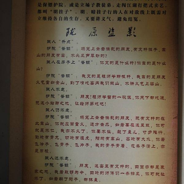 门票上的第③个景点。是唯一一家集镖局与教场于一身的传统武术陈列馆,与票号日升昌倚门相望门票上的第③个景点。是唯一一家集镖局与教场于一身的传统武术陈列馆,与票号日升昌倚门相望。它分为前后两个部分,前面是陈列馆,共三进院,后面是一个演武场。前院后院,有一只猫特踏实的在睡觉
