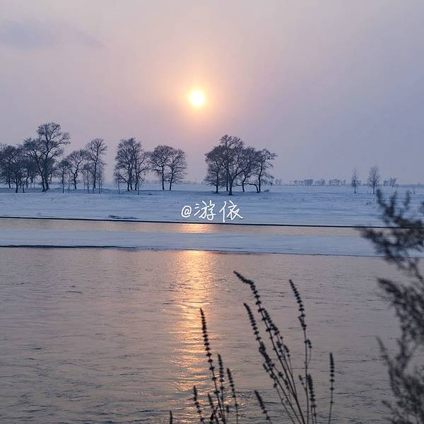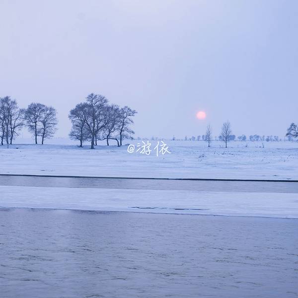 一下车真的好美,司机大哥说,这个时间是看日出...早上六点闹钟响来,马上冲去大厅问客栈老板今天有没有雾凇,得到了肯定的回答,跟老板买了门票,立马洗漱出门。出门雾气好大,坐上客栈安排的车,一溜烟到了江边。