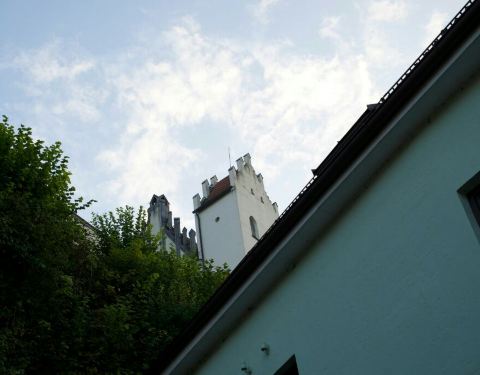 登高童話新天鵝堡 便可俯瞰阡陌桑田 阿爾卑斯湖邊 有山巒起伏 土黃色的赫恩斯堡便座落在山頭上 下午四點之後 便無法入內參觀 只能和雄偉的大鐵門合影了