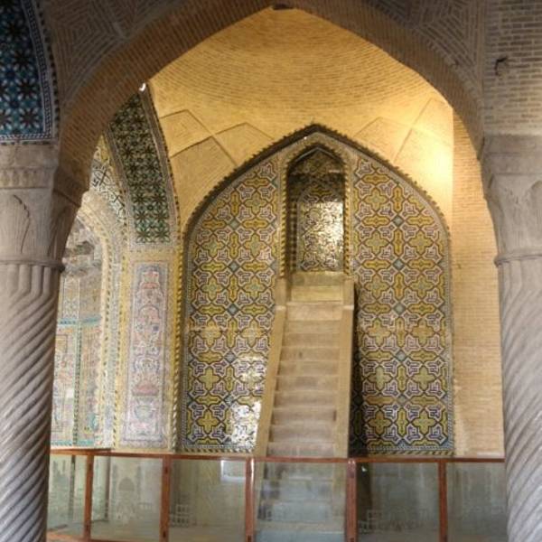 ...大的中庭,清真寺内部有优美的拱廊结构,一半朴素,一半贴满釉面彩砖,一处长阶梯的讲道台用整石凿成始建于赞德王朝,经恺加时期整修后成型,两道伊万门及回廊辟出一个诺大的中庭,清真寺内部有优美的拱廊结构,一半朴素,一半贴满釉面彩砖,一处长阶梯的讲道台用整石凿成。工艺很精湛。