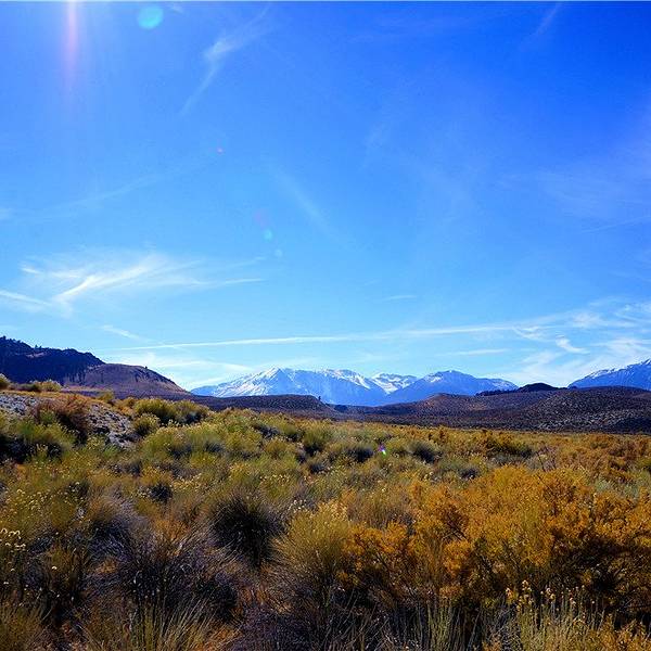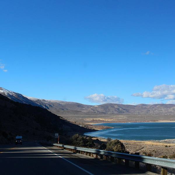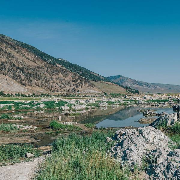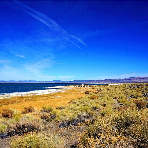 ...感觉就是荒凉,岸边的荒草配上湖边的乱石,给人毫无生机的感觉,不过景色倒是一等一的,非常值得一来继续往Mono lake出发,Mono lake并不远,距离猛犸湖也就是30英里的路程,半个多小时就能开到。这天走的路和前一天在死亡谷走的路反差非常大,一个是荒漠戈壁,一个是雪山草地。