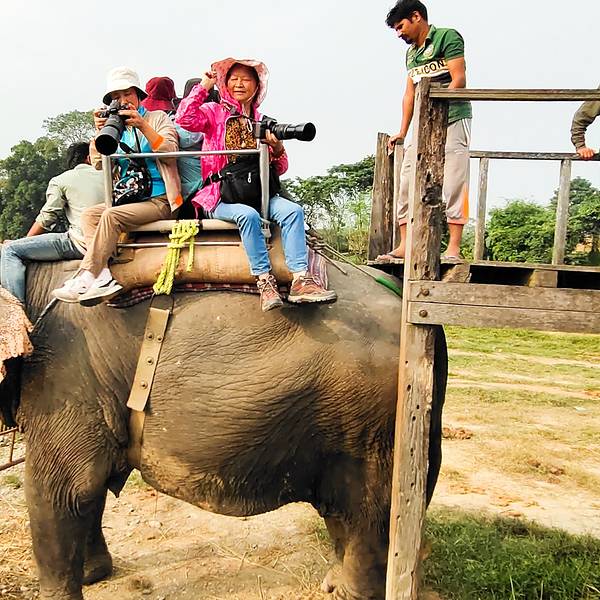 实用 【推荐线路】游客必须通过公园内的台阶上下大象。更刺激的是还看到很多鳄鱼就在不远处安静地伏在河滩上【特色】森林公园里住着各种野生动物,大象、犀牛、麋鹿等。我在很多东亚国家坐过大象,都是两人一起,但南亚的奇旺是四人一起的,高于二米的大象很是威严,带我们越过丛林,走向深处,一圈下来是40分钟左右。