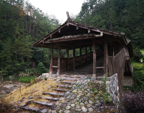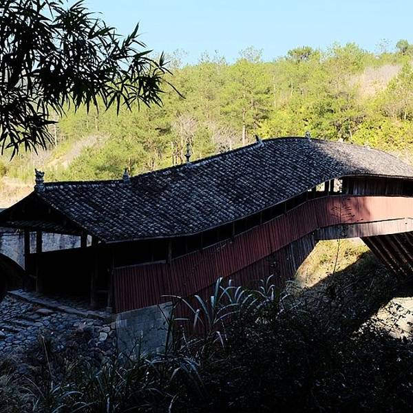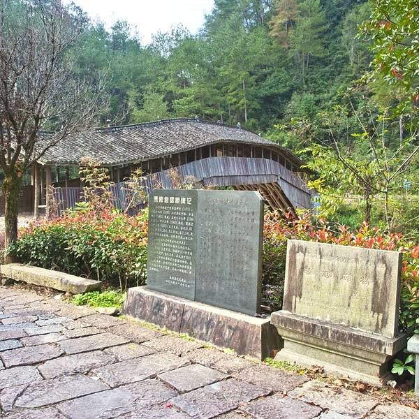 第一眼见她就让人眼前一亮,感觉真是非常漂亮,黑黑的拱桥,凌空高架,结构精巧,很喜欢!古代张天树的《长桥夕虹》,就是赞美仙居桥的一首诗。桥头有好几块碑石,记载了她的历史和介绍。欣赏半天待转到另一面时,呵呵,却发现桥身是红色的,也许另一面由于阳光强烈也掉了色吧。上午的阳光丽丽地照射在红色的桥身上,蓝天绿树碧水中美艳得无与伦比。下一班车要一个小时之后才会来,我们便有许多时间来欣赏她,照样要先围着她前后左右上上下下地欣赏拍照,穿过桥是一条古道,百度记载这条古道也是有来头的,张天树也有《仙陵古意》来描述它。我们沿古道向上爬了一段,感觉再向上并没有好角度来拍摄桥了,便没再向上,进入桥内休息,静静地坐下,与这300年前带有灵气的尤物交流感受……实用攻略: