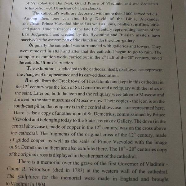 教堂是12世纪末建造于弗谢沃洛德公爵宫殿内的一座教堂。使之享誉盛名的,是外壁上刻满的浮雕。圣人、历史上的英雄人物、动植物等,浮雕有着相当丰富多彩的形象。是现存的同类教堂建...第二站 德米特里耶夫斯基教堂