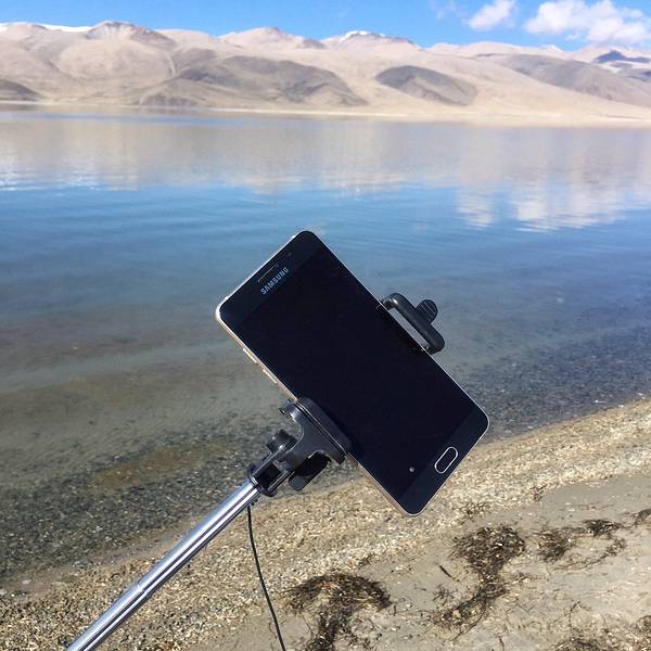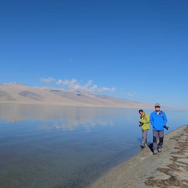后来从通讯录里联系到了他的家人,顺便也就联系到了手机原主人,原来他离我...沿途经过公珠错,此时上午十点多,月亮还这么高。果然是异域啊,跟家里有不小的时差。居然在湖边捡到了一个手机。。还是带着自拍杆的。