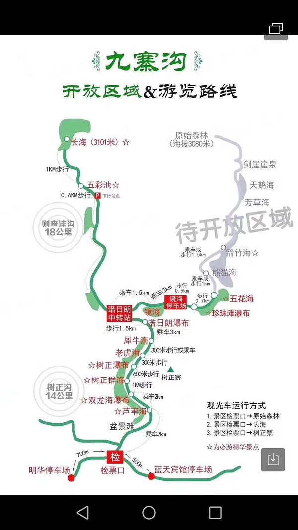 【行程】【九寨沟形状宛如“Y”字形,景区往返全程98公里。里面景区交通就像市区公交,只要凭车票就能随便上车往返各个景点。一般来说,游客都是先乘车到原始森林站,然后再自上而下游览日则沟每个景点(期间乘车到下一个景点)。之后到了诺日朗中心站后,再搭车到长海站,再自上而下游览。就是从诺日朗中心到景区门口的树正沟沿途欣赏犀牛海、老虎海、树正群海等景点。 我们游览的时候,原始森林被封了,只能到达箭竹海站。从五花海到珍珠塔里可走栈道,建议大家不要乘坐公交,边走边欣赏沿途景色,还能呼吸清新的空气。在日则沟我们大概花了5个小时,而则渣洼沟花了2个小时,基本上好看的景点都分布在右侧。时间方面,基本上一天游完九寨沟主要景点是没有问题的,关键在于不要在一个景点上逗留太长时间。要注意的是,淡季,一般在4点钟左右就开始“赶客”, 那时基本就只能乘车游览树正沟的景点了