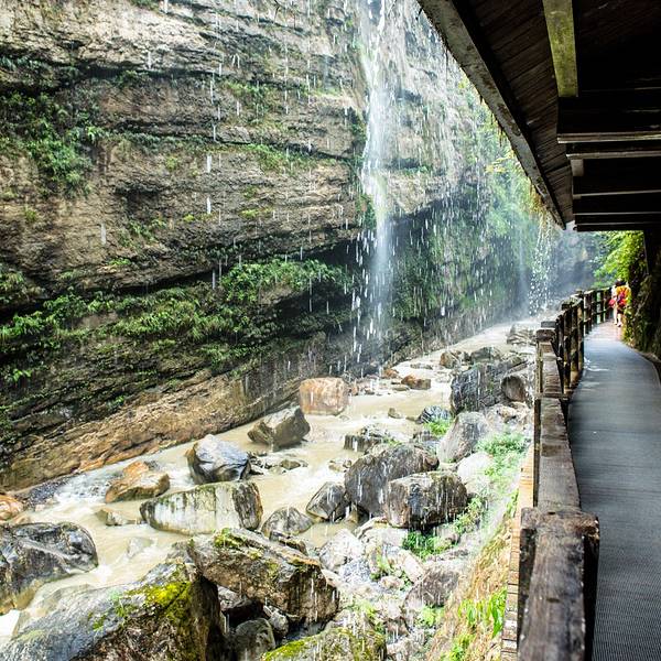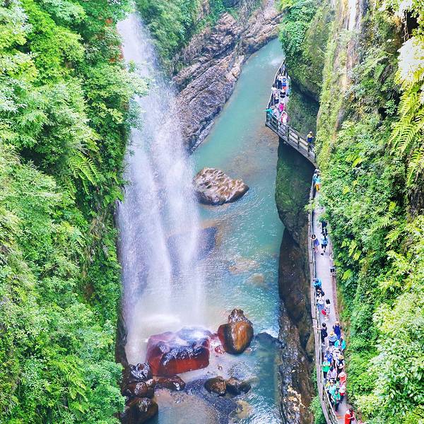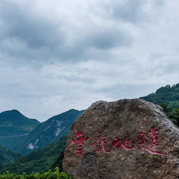 云龙地缝是一条罕见的U型地缝,既两边的石壁都是垂直到底的。据说全长有50公里,景区开发区域只有几公里。地缝里有河流、瀑布,四周阴凉,温度比地面要低许多。