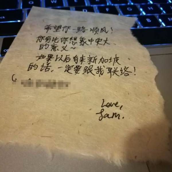 从琥珀堡回来,中途还可以下车看看水上宫殿,不过就是在等公交车就不容易了从琥珀堡回来,中途还可以下车看看水上宫殿,不过就是在等公交车就不容易了,刚好遇到两个新加坡姑娘一起包了一辆tuktuk车,回到市区。两个新加坡的小伙伴临走前,送来的小纸条,旅行路上总是有新朋友