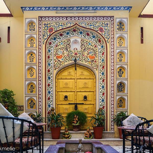 也正因为粉色吧,让这座城市散发着一股温润柔和的气质。在机场打了辆出租车去酒店,500卢比,其实很便宜。但是后来发现他们不管去哪儿都会喊500卢比,其实说可以跟他们讲价的,也很好讲价。我们的酒店在老城外,是一家很漂亮的酒店。