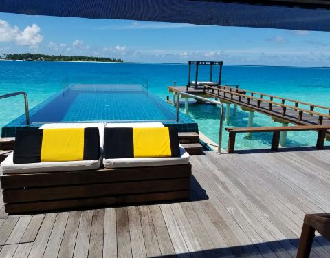 酒店有沙屋和水屋2类房型,而水屋也有2种,一种是未改名前的房型重新翻新过(我当时就是住这种),另一种是新建的,2种水屋分别在小岛的2端,各有特色,新建那边的海比较漂亮,纯蓝!原建那边就比较适合浮潜,珊瑚和鱼类都比较多在那边~新建的水屋,这里的海水是蓝色嗽口水倒灌的吧?我们的房间在原建水屋的最尽头处。环境还是十分不错的。露台下去直接就可以浮潜,私密度很高。水屋下浮潜岛上耀眼的白沙屋。接送游客的快艇,从马累到岛大概30分钟。岛上生态SPA馆内精美的布置,马尔代夫的SPA很出名,但都是是蛮贵的,我们要了个性价比较高的双人情侣套餐,大概1000多人仔。但难得来一次,就不要留下遗憾了,SPA馆就不方便拍照了,但馆内水池的view实在无敌,大家有兴趣可以上网找找图片~岛上的无边泳池。就这样看着日落,什么都不用想我爱马代,我爱Velassaru 展开