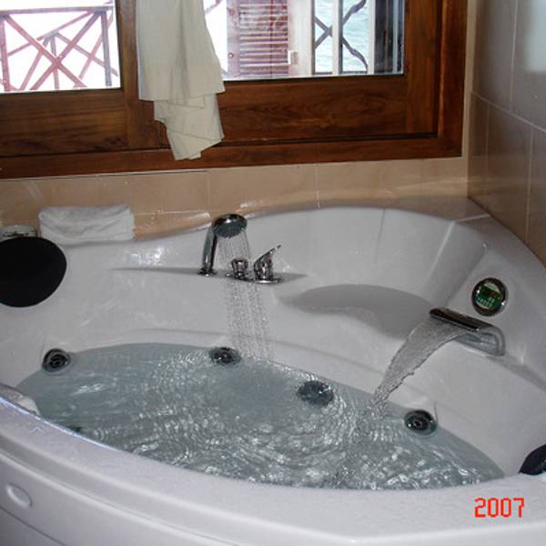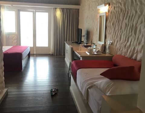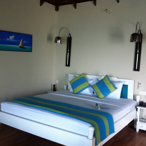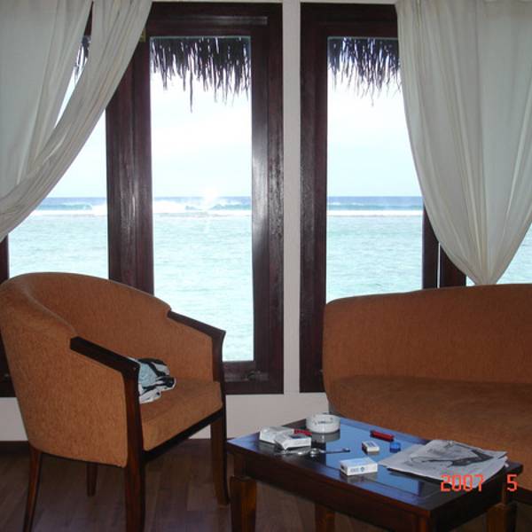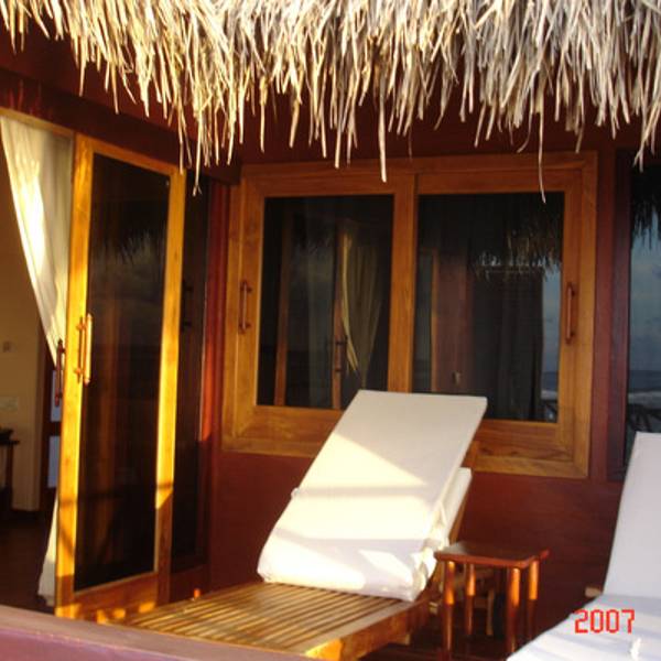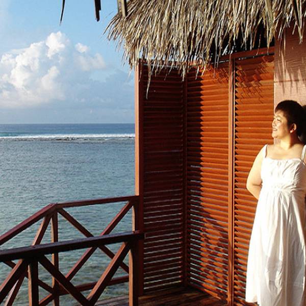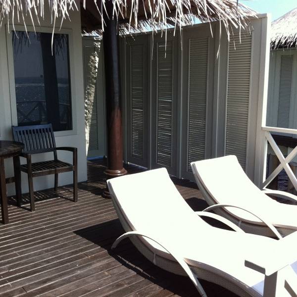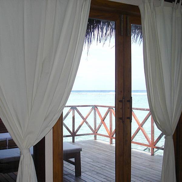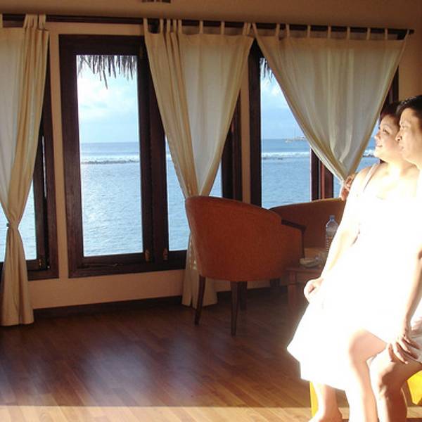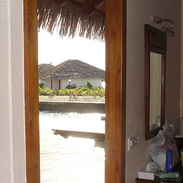 办理了入住,我们之前在淘宝上订了梦幻岛3天的水上屋。向导带我们来到我们的小屋。向海中蔓延出去的一排小屋,我们是其中的一间。房间蛮大的,有落地的大窗户,打开下面就是大海。洗漱室有双人浴缸,可以直接通往阳台。阳台有两把躺椅,有木头的阶梯可以直接下海。洗漱用品很全,而且每天有送两瓶矿泉水。