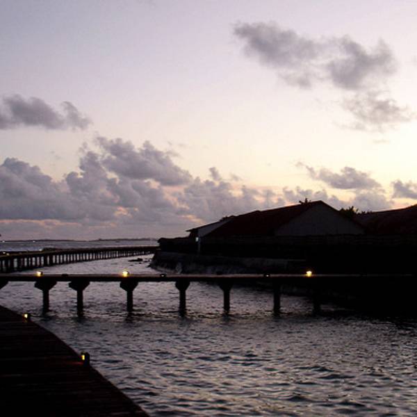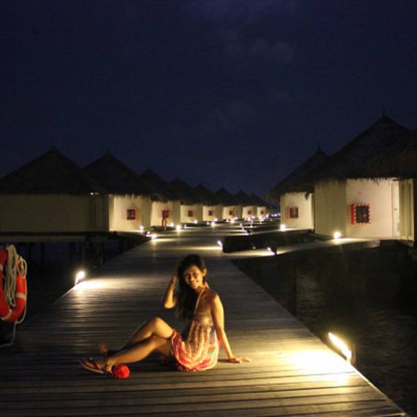 我们定的半餐,每天只有早晚餐,两餐都是7点半到9点半,这一天除了在飞机上吃了一顿早餐之外,已经一天没进食了。一直等到晚上七点半,出门奔赴餐厅。这个点,梦幻岛已经全部笼罩在夜幕中。水屋的连桥两旁都有地灯,大概是怕人不小心掉进海里吧。夜幕中听着一波接一波的海浪声,抬头看到晴朗的星空,吹着海风,感觉无比惬意。