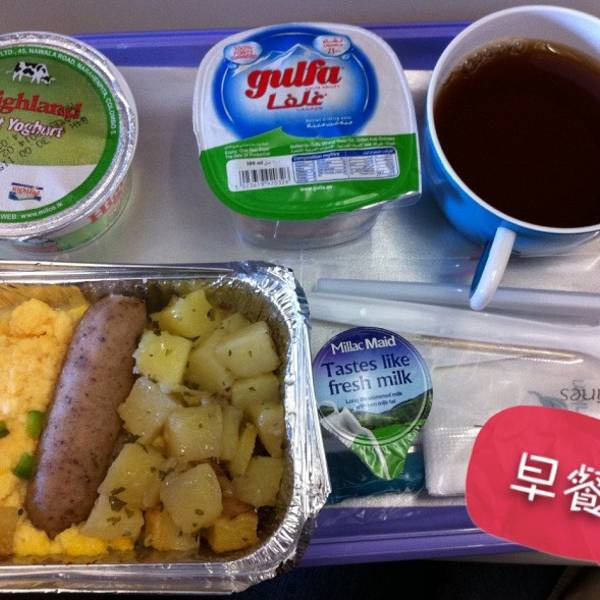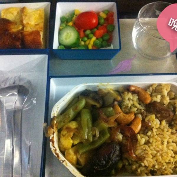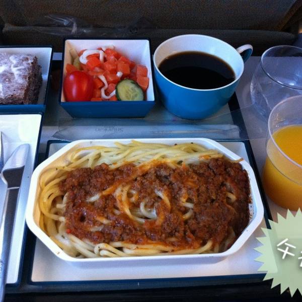 飞机起飞后,先发免费湿巾,再发餐饮菜单,又发耳机。不一会发了飞机餐,把我惊到了。我坐飞机不多,这一餐绝对是我遇到过最好的飞机餐。意面、布朗尼、玉米沙拉,餐具全部是不锈钢的,两个杯子一个咖啡杯一个玻璃杯,面巾纸、糖包、盐包、胡椒包。冷饮除了可乐橙汁等还有各种啤酒,热饮有茶和咖啡。超赞!