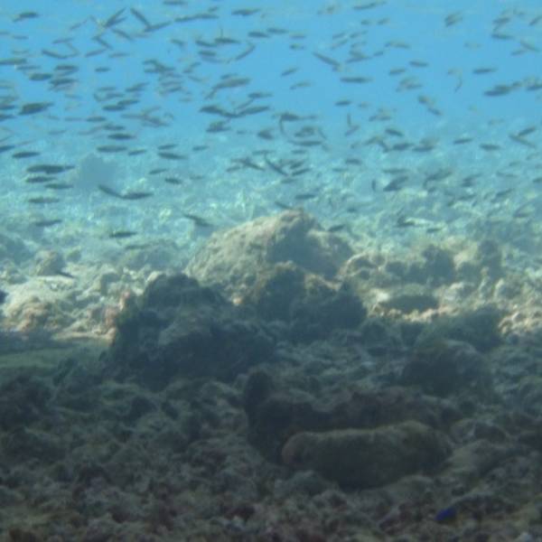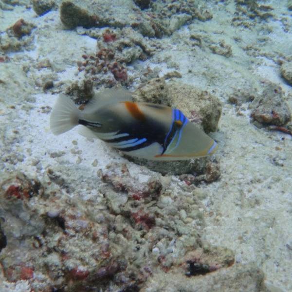 休息到下午四点半,起床准备浮潜。这时候阳光不太强烈了,屋子下面基本上没有阳光直晒,适合浮潜,不过正是退潮的时候,海水已经变得很浅了,很容易碰到海底的珊瑚。潜了一会儿,还是之前看到过的鱼类。