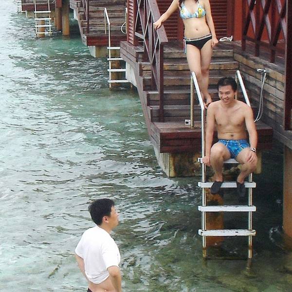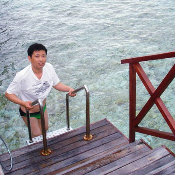 水屋旁边这片浅浅的海域,看似平静实则暗流汹涌。刚才看着惬意,穿上救生衣从扶梯下水飘浮。