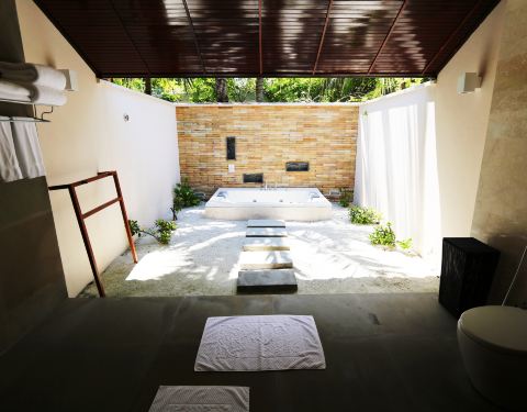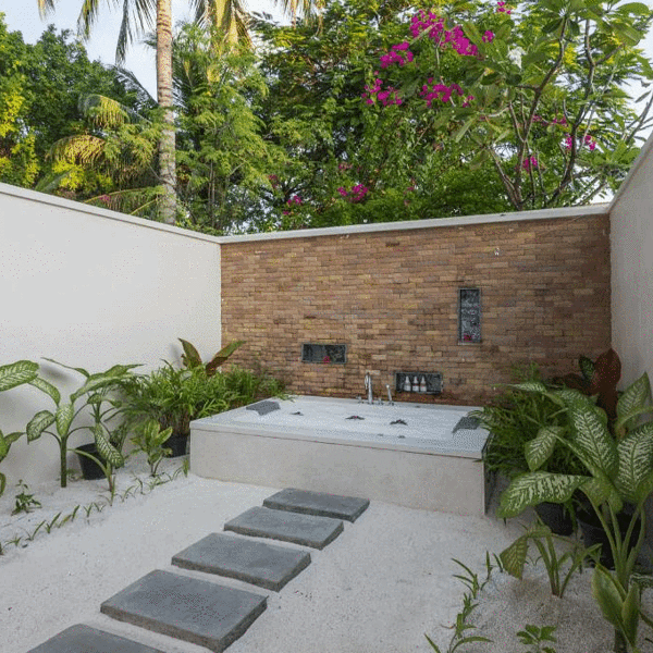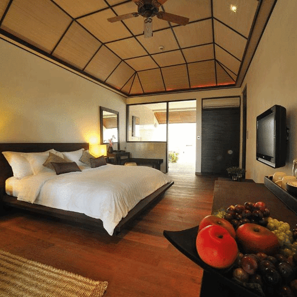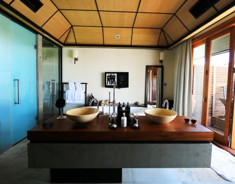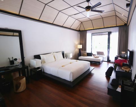 上岛后先check in, 稍歇后跟着中文服务员看房。先带大家看看我住的沙滩别墅:直接从私人沙滩入口进入甲板,甲板上有两张躺椅,可以在躺椅上欣赏沙滩海景,一进门首先是一张小沙发床,往前是一张大双人床,主卧室继续往里深入是另一边的阳台。阳台上是一边是室外淋浴设施,一边是洗手台,再走几步就是露天按摩浴缸。别墅共68平方米,虽然小但是设施齐全而且位置很好。每间房都标配空调、电视、国际电话、迷你吧、咖啡和茶冲泡设施、免费瓶装水、洗浴用品、吹风机等。房间内的迷你吧每日补充冷饮、水和零食。岛上沙屋就位于岛的中心,所以去哪都很方便,附近就是主餐厅、酒吧、水上运动中心,吃的玩的很齐全。但是缺点是私密性不够,离儿童俱乐部、运动中心较远。水屋私密性比较好但是离岛上设施有点距离,这个就看取舍了,具体房号和对比大家可以私聊问我。