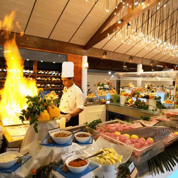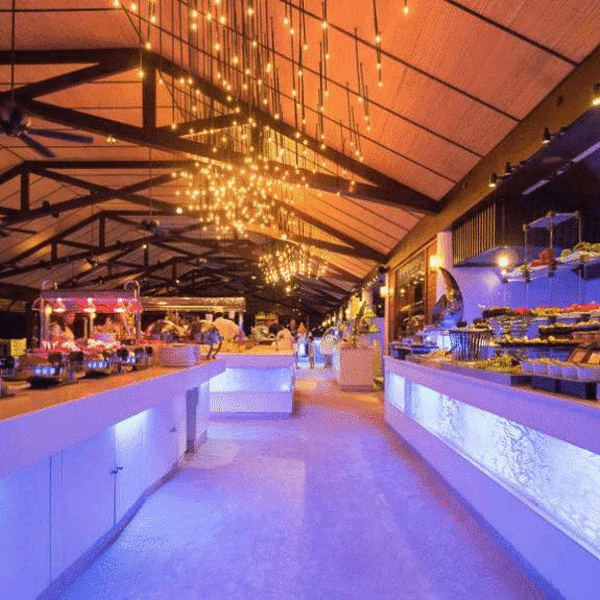 ...赖,个人觉得最好吃的是煎鱼和寿司,特别新鲜的煎鱼撒上柠檬汁配上酱料,喜欢海鲜的朋友一定不要错过工作了一上午,是时候去祭祭五脏庙!岛上共有4家餐厅3间酒吧,可以尽享各国美食。小黑把我带到主餐厅(Lily Maa)吃自助餐,这里从到早晚都营业,提供自助餐或者点餐,还供应80多种来自世界各地的优质葡萄酒。小...工作了一上午,是时候去祭祭五脏庙!岛上共有4家餐厅3间酒吧,可以尽享各国美食。小黑把我带到主餐厅(Lily Maa)吃自助餐,这里从到早晚都营业,提供自助餐或者点餐,还供应80多种来自世界各地的优质葡萄酒。小爱个人觉得味道不赖,个人觉得最好吃的是煎鱼和寿司,特别新鲜的煎鱼撒上柠檬汁配上酱料,喜欢海鲜的朋友一定不要错过!在介绍单上还了解到主餐厅每天晚上有不一样主题的自助餐,虽然每天吃的都是自助餐但是每天都能有不一样的美食体验,简直太棒啦。饭毕四处走走,没想到隔壁就是Spirit酒吧,吃饱之后去喝点东西美滋滋,听说晚上这里还会有钢琴酒吧和AMBA乐队的定期演出。吃饱喝足要去逛逛岛,恰好Aqva泳池酒吧距离主餐厅才几步路的距离,顺便去晒晒太阳消消食。这里是一个餐吧,旁边就是无边泳池,一价全包的客人可在此享受免费软饮,正餐的话需要自费单点。要注意的一点是,这个酒吧只向成人开放。晚上去了Tamarind餐厅,因为一价全包套餐里包含了一周一次的免费晚餐,不吃白不吃哈哈!这是一家融合了亚洲风味的特色餐厅,主要是一些泰国、印度、中国菜式,米饭、面条、沙拉和甜品应有尽有,还提供水上座位,让你有一次海上用餐体验。第二天在主餐厅的早餐依旧很丰盛,各种面包水果饮料。小爱还遇到了一桌中国家庭,刚好和他们拼桌听了听他们的游岛感受,一起坐在海边,吹着海风吃着早餐,惬意的新一天又开始了。除了这几个餐厅,岛上还有vibes餐厅,如果是在蜜月期,会在这里赠送一餐烛光晚餐。每天晚上,AQVA酒吧中心还会有专门厨师为我们展现铁板烧的烹饪艺术。 展开