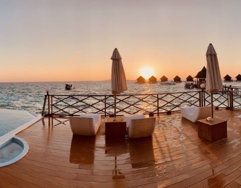 清晨日出逐海豚让人兴奋不已,黄昏出海垂钓,浪有点大,不过没到十分钟就钓到了一条,那运气也是没Sei了性价比很高的一个岛,离机场很近,快艇只要20分钟左右就上岛了。如果想要去浮潜又不追求奢华享受的,可以选择。清晨日出逐海豚让人兴奋不已,黄昏出海垂钓,浪有点大,不过没到十分钟就钓到了一条,那运气也是没S...性价比很高的一个岛,离机场很近,快艇只要20分钟左右就上岛了。如果想要去浮潜又不追求奢华享受的,可以选择。清晨日出逐海豚让人兴奋不已,黄昏出海垂钓,浪有点大,不过没到十分钟就钓到了一条,那运气也是没Sei了。如果不会游泳,出海浮潜还是要谨慎,毕竟海很深,水也很咸,大口喝水就不好了。酒店的餐饮一般般,但是风景不错,看着那蓝喝着饮料还是很写意,沙房很大,私密性还可以,我们的房间正对着一片海,感觉还不错。水房隔音很好,丝毫没有被海浪声影响,但是期间有一次跳闸,找小黑马上修好了,也算可以了吧!另外,这个岛允许孩子上岛,还有一个沙发床加床,之前的担心也就烟消云散了。Reception有点凶,问点事情像犯了错误似得。总体来讲还算是不错的一次旅行,下次期待水飞,再去试试其他的岛屿 展开
