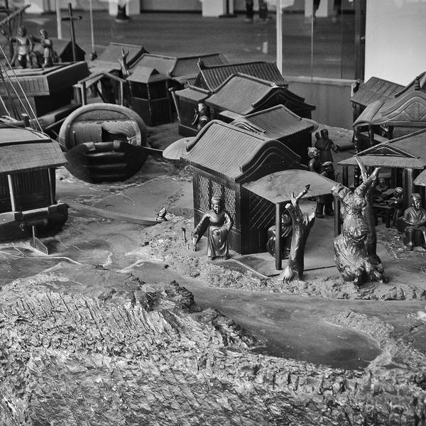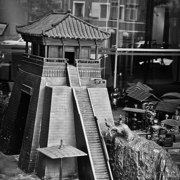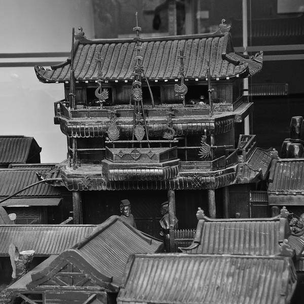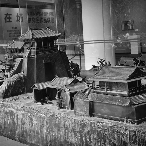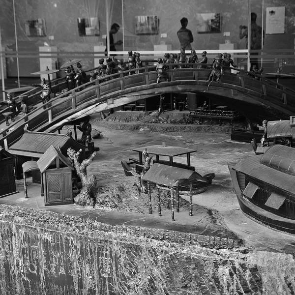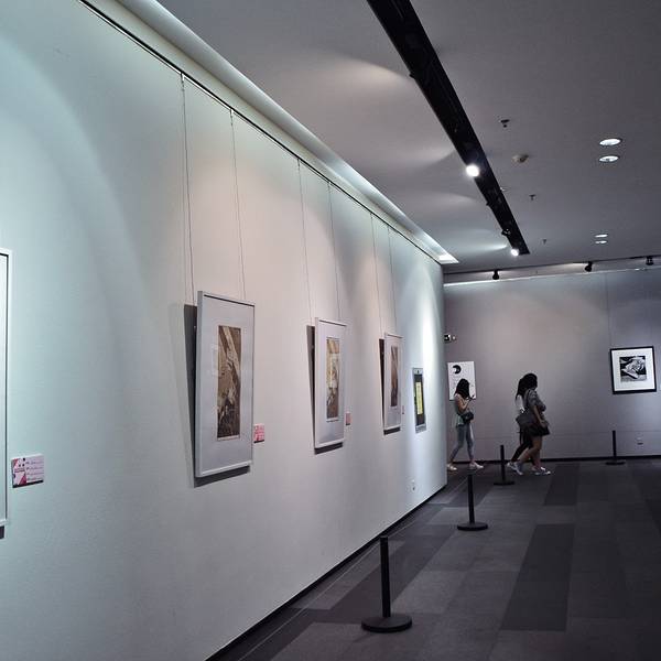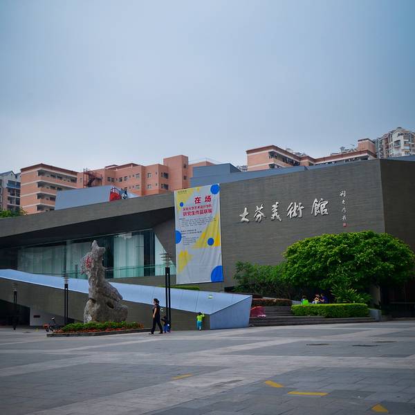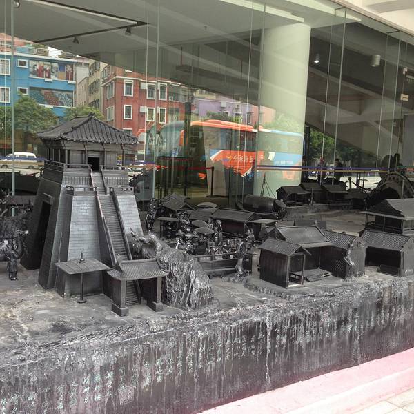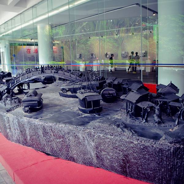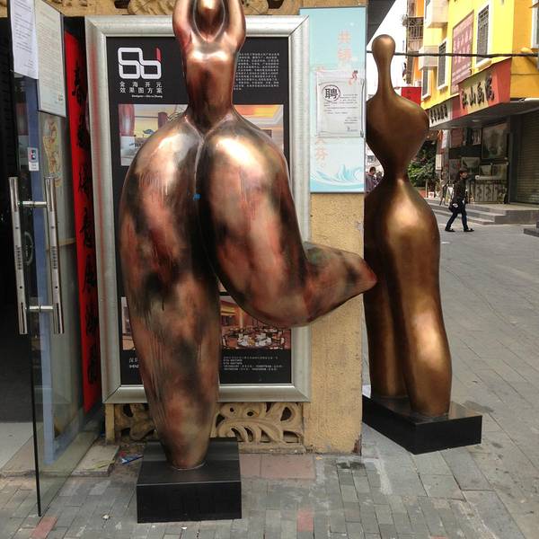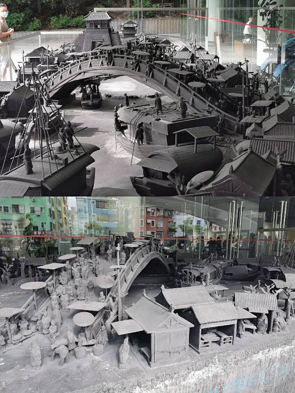 紧邻大芬村有一座大芬美术馆,灰白色调的简约建筑风格。在美术馆入口处有一处人物雕像,姿态各异,像极了清明上河图。