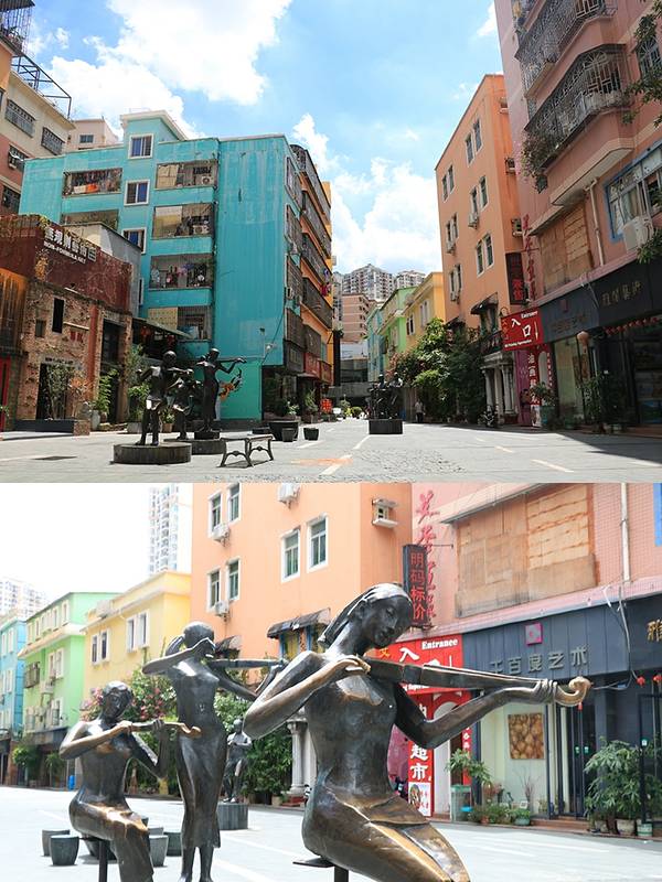 大芬村入口,几栋颜色鲜艳色彩分明的楼房给人以明亮的视觉冲击。街道上形态各异的雕像和店铺外摆满各式各样的油画,让人目不暇接。