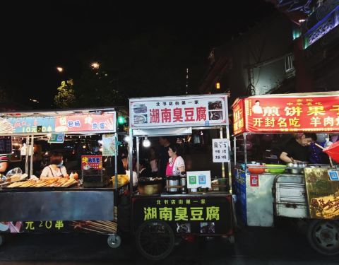 书店街的夜市大部分卖衣服、首饰、鞋包,小吃也有一小部分,比较有名的有南北书店就交叉口上的“金记煎饼果子”(性价比不高,可以考虑中山路上铜锣湾百货前的“水记煎饼果子”)、“老九羊肉炕馍”(清真挂牌)、白家羊蹄(以前在那里,这几次去开封没找到,这家特任性,晚上就出摊儿一会,一锅辣,一锅不辣,卖完就走,从不续锅,如果大家没找到,一定多打听问问,鼓楼夜市其他家的味道虽然也不错,但还是不如他家) 。最近几年流行涮菜、麻辣烫类的,北书店街夜市也有十几家,推荐北书店街向南120米西侧(新新饭莊还要往南)“双星专卖店”门前的那家,是在门洞下面。