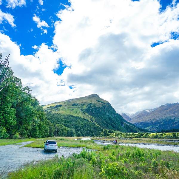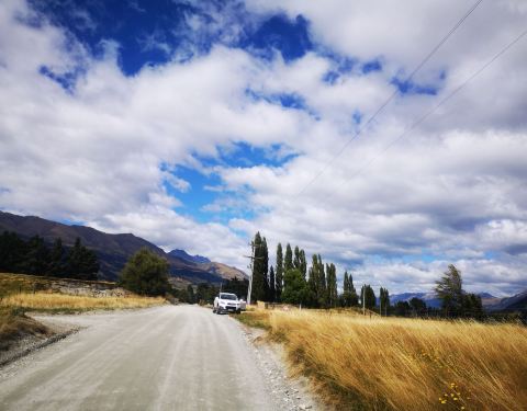 砂石路出现,一脸小轿车正面开过来,Grande投以同情目光:“Poor car.(可怜的车。)”我突发奇想,问德国小哥:“Switzerland and New Zealand, which one do you think is more beautiful?(你觉得瑞士和新西兰哪个更美?)”