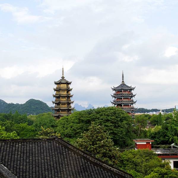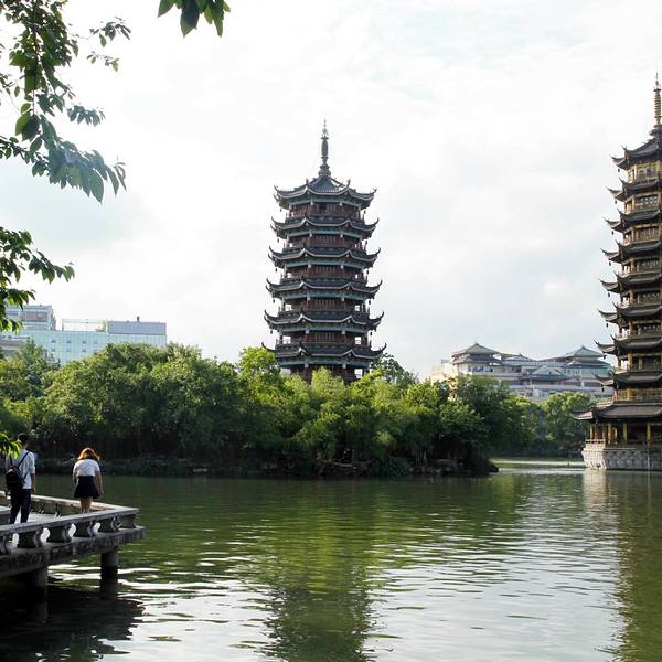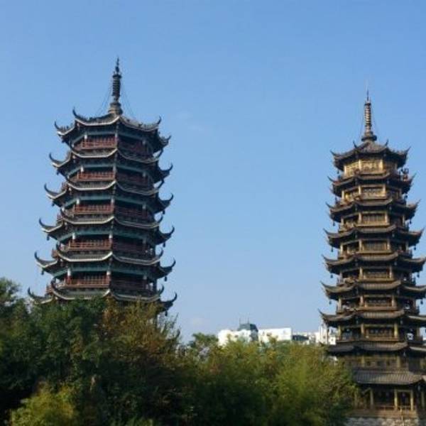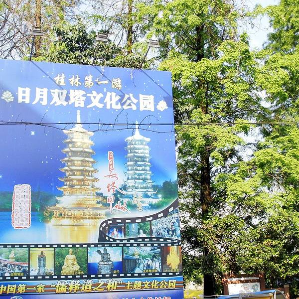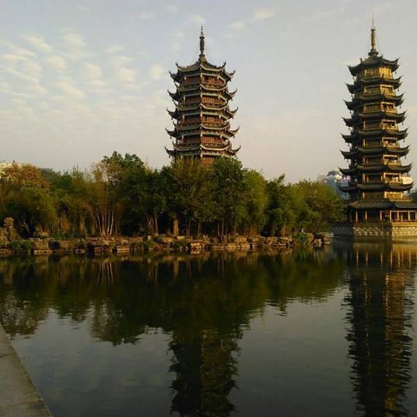 日月双塔文化公园是坐落于桂林市中心杉湖中的两座宝塔,日塔为铜塔,月塔为琉璃塔,两塔之间以湖底一条10多米长的湖底隧道相连。每到夜晚,两座塔在灯光映衬下分别散发着金银两色光芒,倒影在湖中的景象格外漂亮。日塔高41米共九层,它的通体均为纯铜装饰,金碧辉煌,铜塔所有构件如塔身、瓦面、翘角、柱梁、地面等完全由铜壁画装饰。塔内有电梯供游客观光乘坐,在日塔一层有祈福铜钟,可以撞钟祈福。同时,在一、二层还设有茶庄,还可以品茗赏景。月塔高35米共七层,为琉璃塔,它通过水下10多米长的湖底隧道与日塔连接。月塔每层的雕花彩绘门窗寓意不同的主题,富含中国传统韵味。其地宫之中有桂林明代青花梅瓶大型壁画,而一层面湖处有“太极鼓”,可以击鼓一展雄姿。日月双塔文化公园的四周、内墙、门窗等处都充满了五彩缤纷的图案,颜色主要以黄、绿、白、蓝、黑为主。这些壁画主要反映了桂北文化,图案以各种花草植物和‘瑶王印’为主,体现了少数民族追求精美生活的文化特征。如果不准备花钱登塔,只是想看下或者拍摄下这个桂林地标,可以在杉湖沿岸观看。观看的理想时间是晚上,每晚日月双塔文化公园的灯光会亮起,一座为金黄色灯光,另一座为银白色灯光。