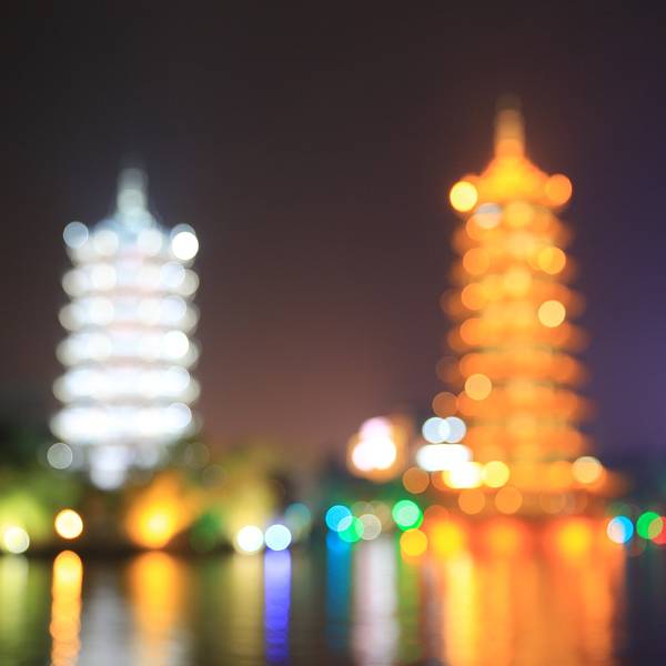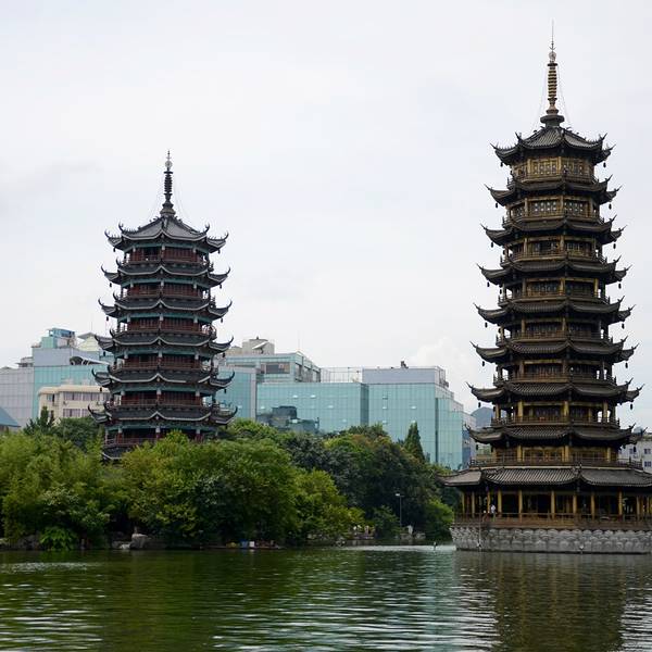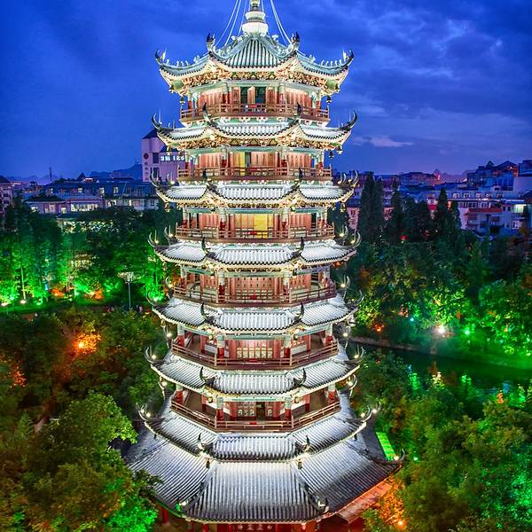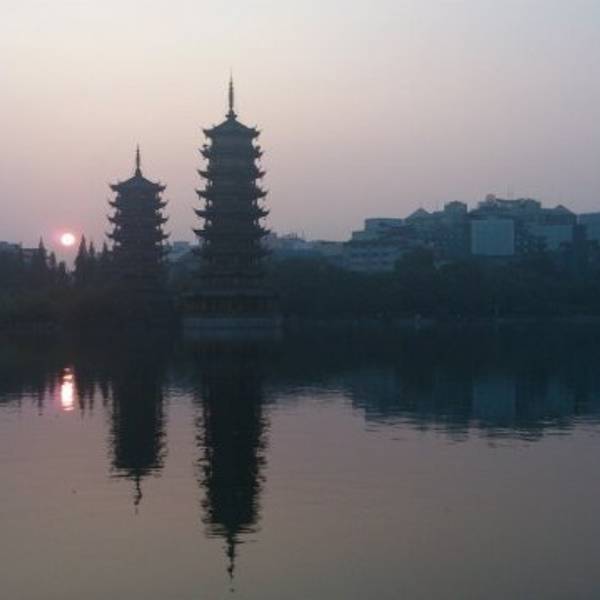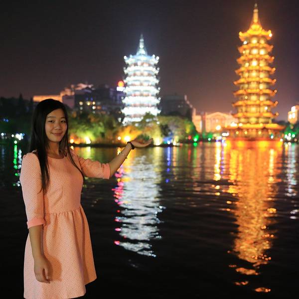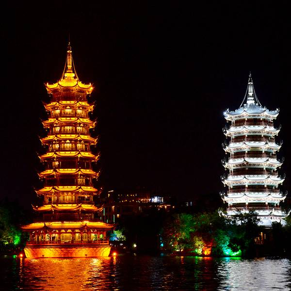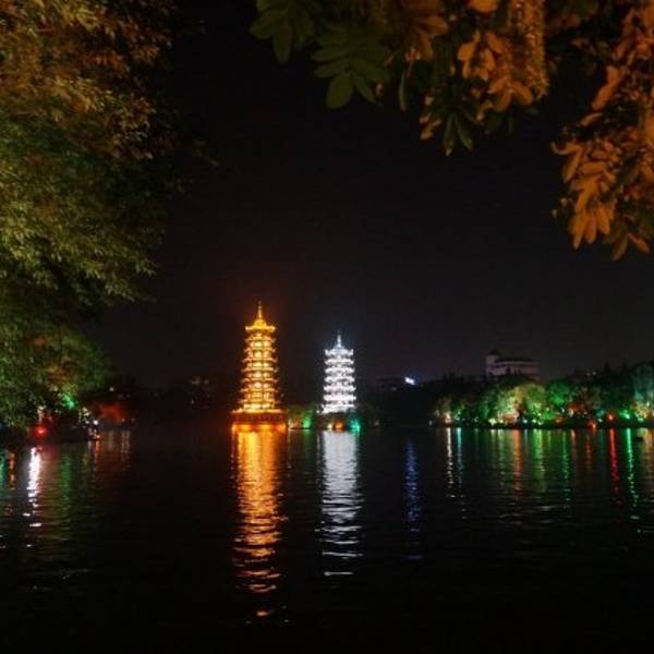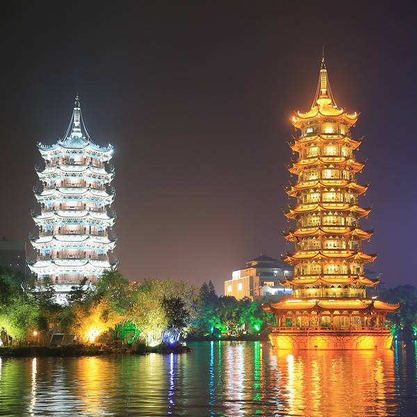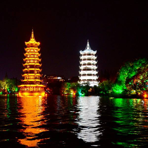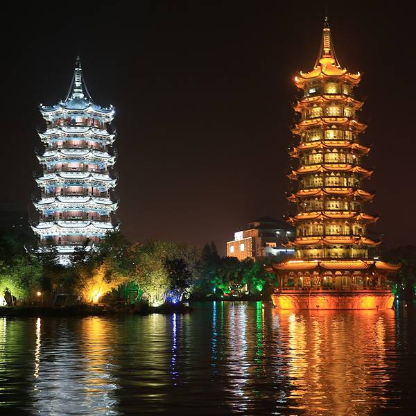 桂林地标建筑,夜晚双塔的倒影格外美丽。